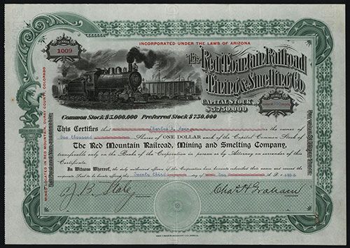 Arizona, 1905, I/U, 1000 Shares, #1009, Black print on green border and underprint, Locomotive at railway yards top center, VF condition, Chas. H. Elliott Co. Railroad and stock listed in Cox.