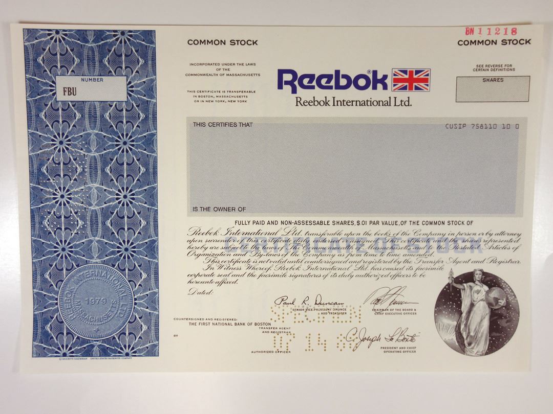 Massachusetts, 1988. Odd Shares Specimen Stock Certificate, Black text with blue border at left and underprint, Reebok logo at top center, allegorical woman with globe at bottom right. Specimen POCs, VF condition, SC-USBN. Reebok International Limited is an Anglo-American footwear and clothing company that has been a subsidiary of German sporting goods giant Adidas since August 2005. Reebok produces and distributes fitness, running and CrossFit sportswear including clothing and footwear.