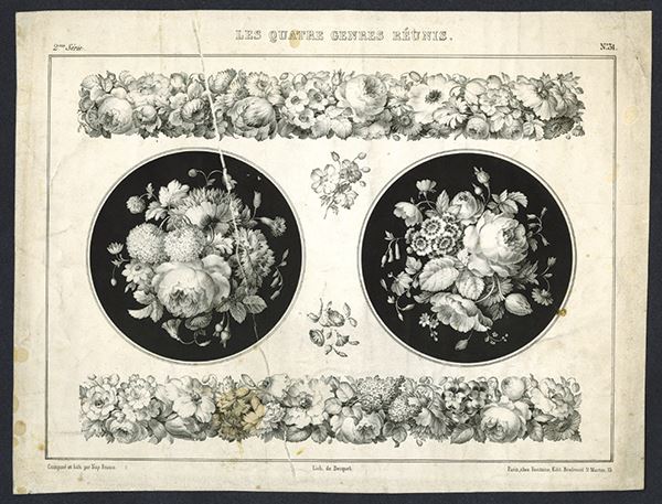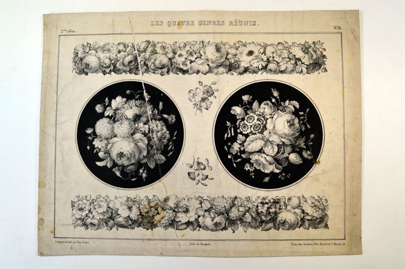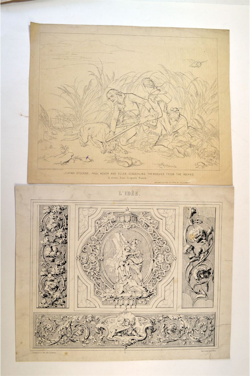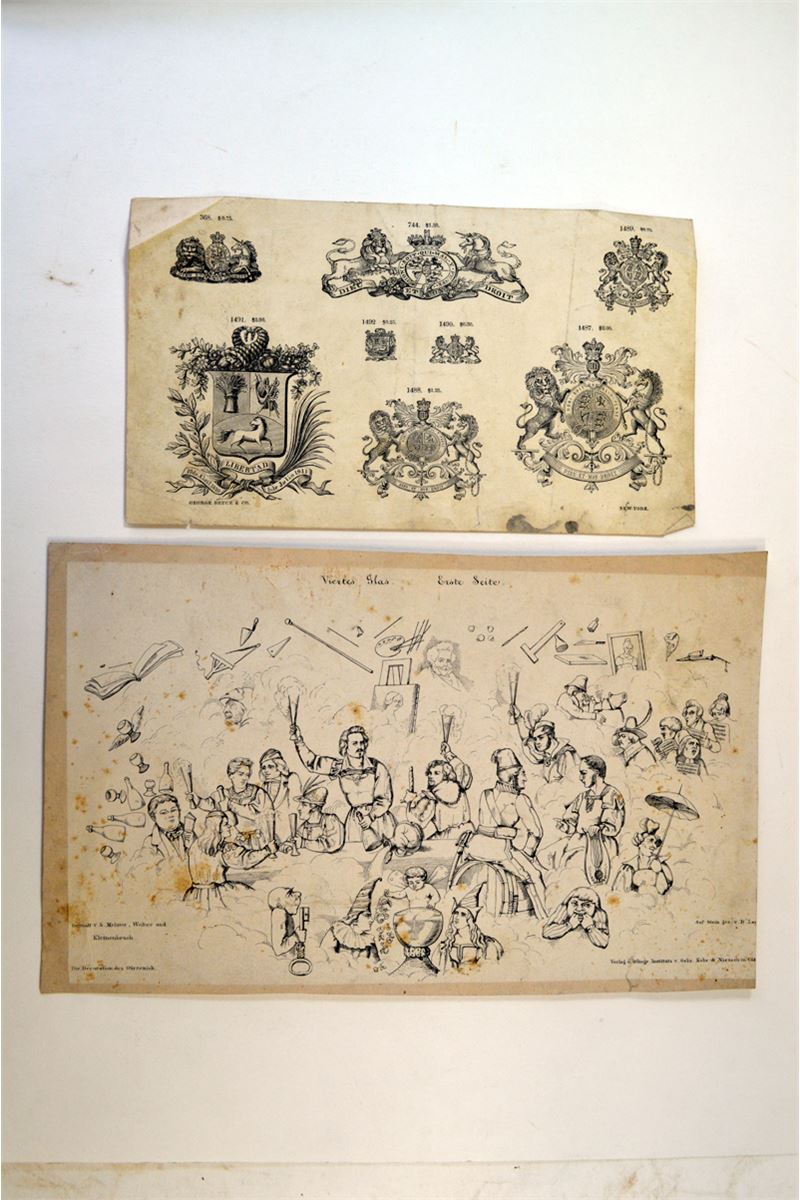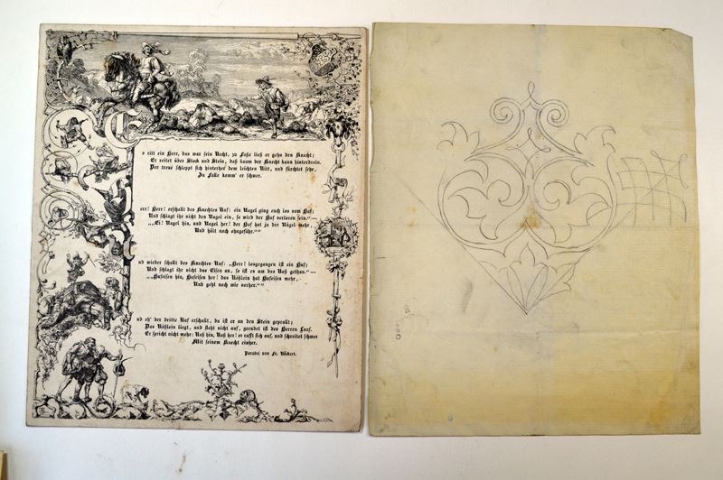 Includes two original pencil scroll samples as well as 7 printed source matter. 9 pieces total.