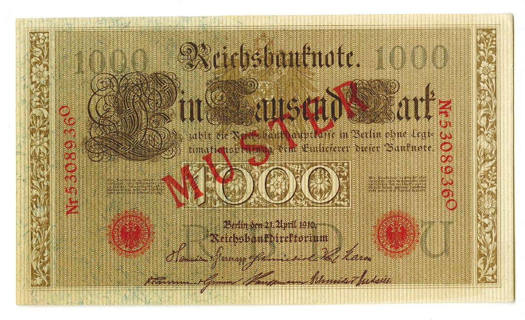 Germany. 1914. 1000 Mark, P-44s, specimen banknote, s/n 53089360 with trailing "O" floating, overprinted or hand stamped "MUSTER", The note appears Choice to Gem Uncirculated.
