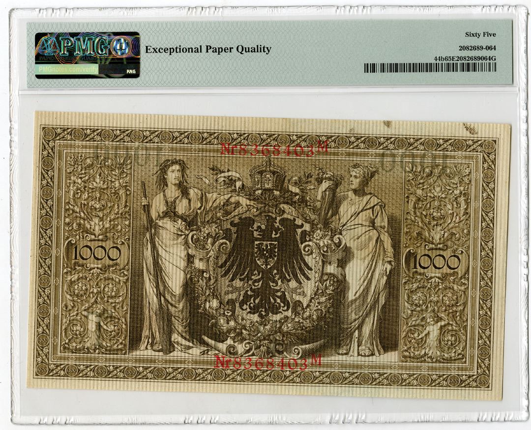 Germany, 1910. 1000 Mark, P-44b, Issued Banknote, Brown printing with red seals and serial number, S/N 8368403M, PMG graded Gem Uncirculated 65 EPQ.
