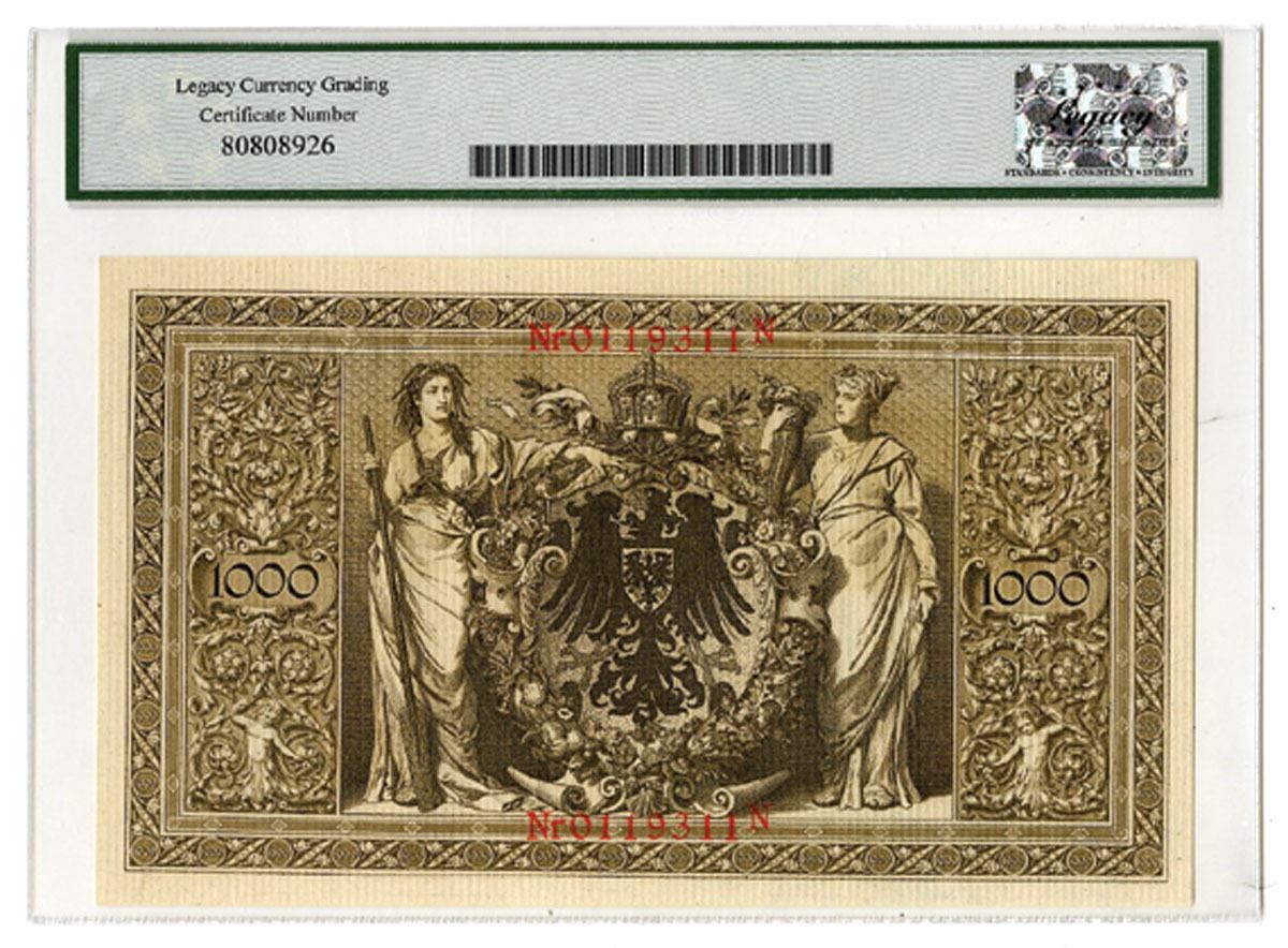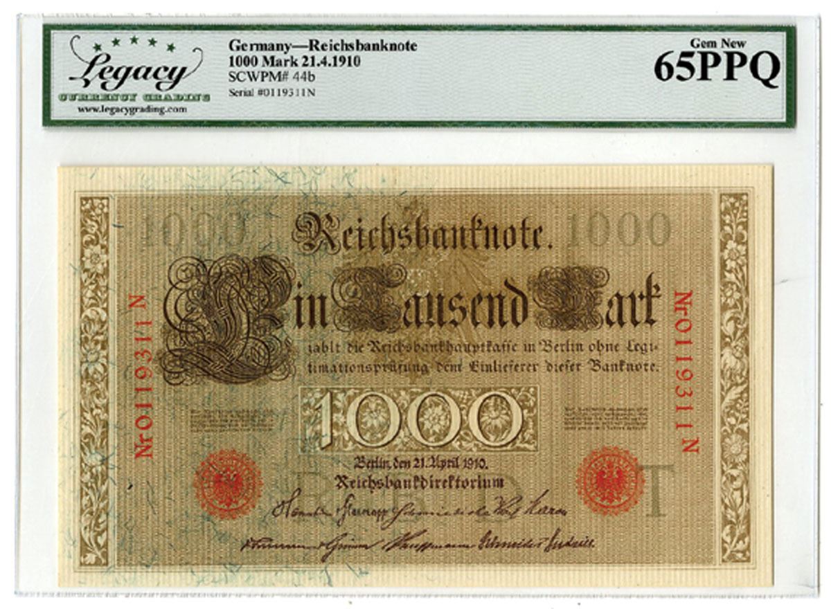 Germany, 1910. 1000 Mark, P-44b, Issued banknote, Dark brown on light brown underprint, Red seal and serial numbers, S/N 0119311N, LCG graded Gem New 65PPQ