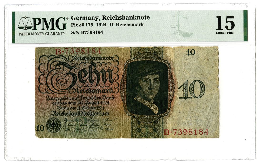 Germany. 1924. 10 Reichsmark, P-175, Issued banknote, Dark green and red-lilac, S/N B7398184, PMG graded Choice Fine 15.