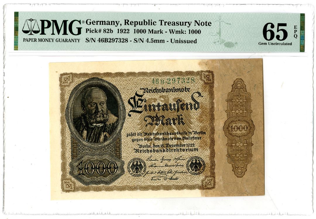 Germany. 1922. 1000 Mark, P-82b, Unissued Banknote. Black on dark brown underprint with portrait, done by G. Penz, of mint master J. Herz at upper left. S/N 46B297328 (printed in 4.5 mm) with watermark of 1000. PMG graded Gem Uncirculated 65 EPQ.