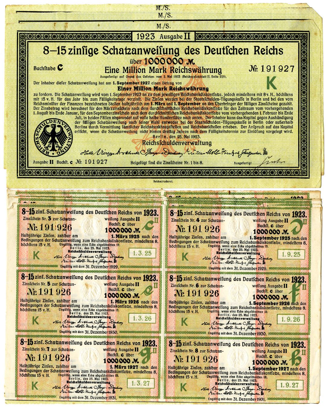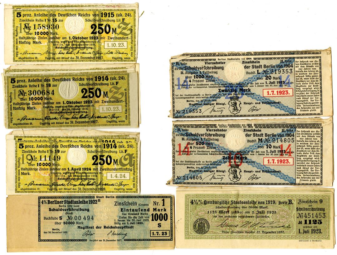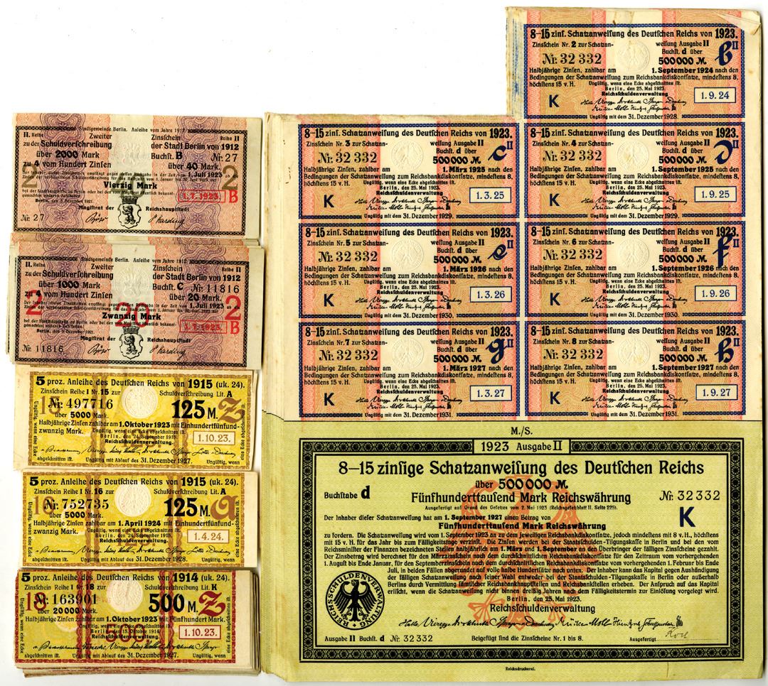 Germany, 1923. Lot of 19 German Bonds and Numerous Bond Coupons, Most are 500,000 and 1 Million Marks I/U Coupon Bonds. VF condition. (19)