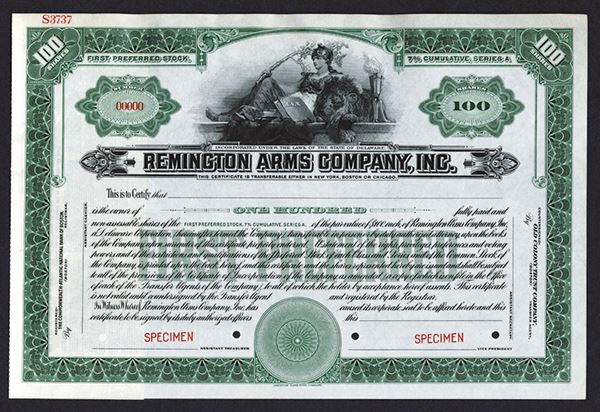 Delaware, 100 Shares, Black on Green border and underprint, Allegorical figure sitting with lion and torch top center, VF-XF condition, ABNC. 7% Cumulative 1st Preferred Stock Series A.