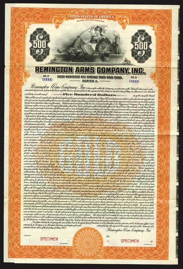Delaware. $500 Specimen 6% Series A 1st Mortgage Sinking Fund Gold Coupon Bond, Black print on orange border and under tint, Allegorical woman reclining with a lion in her arms at top, Specimen overprints and POC's, Fine condition with splitting along fold lines, ABNC.
