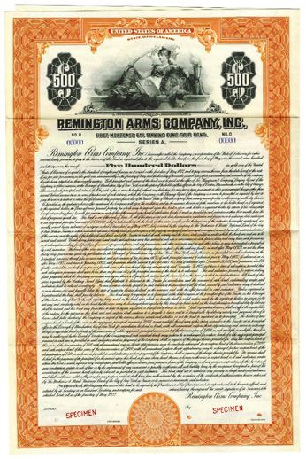Delaware, 1922. $500 Specimen 6% Series A 1st Mortgage Sinking Fund Gold Coupon Bond, Black print on orange border and under tint, Allegorical woman at top reclining on a lion, Specimen overprints and POC's, VF-XF condition, ABNC. Remington Arms Company, LLC is an American manufacturer of firearms and ammunition, and was the largest rifle manufacturer in North America according to the ATF statistics in 2015.