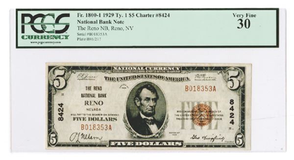 Reno, NV, 1929, $5 Ty. 1, The Reno National Bank, Reno, Ch# 8424, Fr#1800-1.