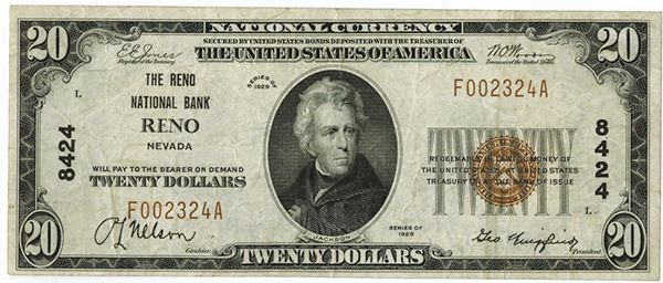 Reno, Nevada. $20, Type 1, Issued banknote, Jones | Woods signatures, S/N F002324A, VF to Choice VF. Always popular Nevada national.