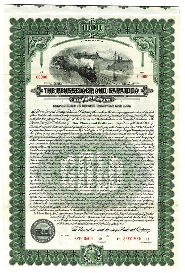 New York. $1000 Specimen 6% 1st Mortgage Gold Coupon Bond, Black print on large green border and under tint, Image of locomotive coming down tracks with another locomotive at top crossing bridge, Specimen overprints, POC's, VF-XF condition. ABNC. Listed Railroad, Unlisted Bond Type.