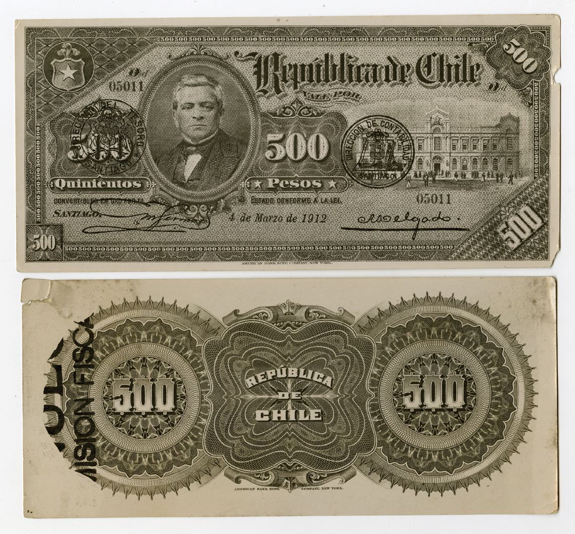 Santiago, Chile, 1912. 500 Peso, P-27p, Obverse and Reverse Black and White photo proofs printed on glossy paper, Front has Man at left with building at right, Back has denomination at left and right with bank name at center, "NOLO Emission Fiscal" stamped, S/N 05011, Fine to VF+ condition. ABNC. (2). Sold "AS IS" no returns accepted. Printed on photo paper, ABNC. The photo proofs of the original notes were used during the production process for comparison of designs and text and for reference. Original photo-proofs from the Thomas De La Rue production and design department.