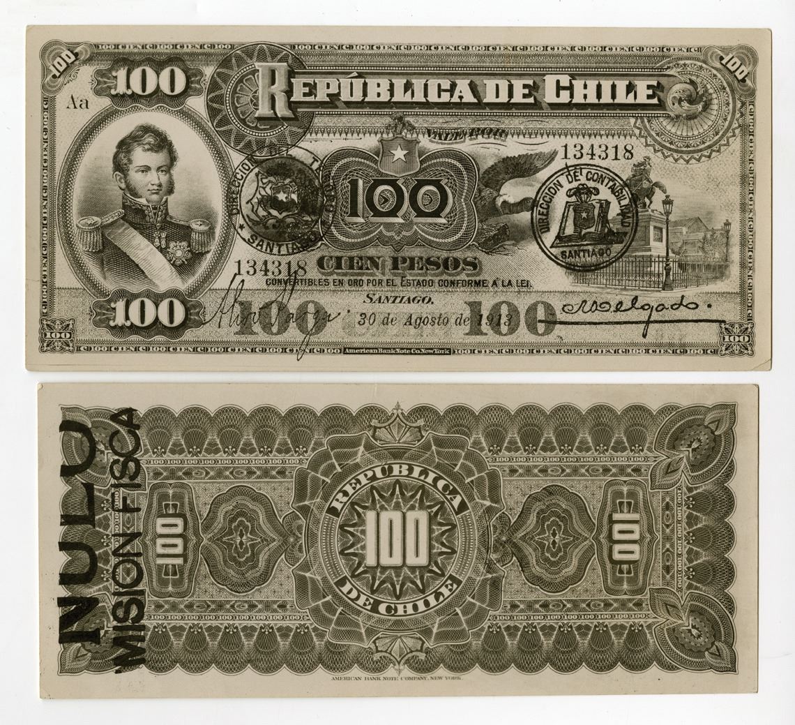 Santiago, Chile, 1913. 100 Peso, P-26p, Obverse and Reverse Black and White photo proofs printed on glossy paper, Front has portrait of B. O'Higgins at left and monument at right, Back has denomination at left right and center with bank name at center, "NOLO Emission Fiscal" stamped, S/N 134318, VF to XF condition. ABNC. (2). Sold "AS IS" no returns accepted. Printed on photo paper, ABNC. The photo proofs of the original notes were used during the production process for comparison of designs and text and for reference. Original photo-proofs from the Thomas De La Rue production and design department.