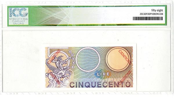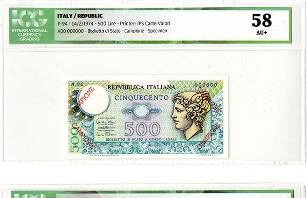 Italy. Specimen 500 Lire, 1974, P-94s. ICG AU+ 58. IPS Carte Valori.
