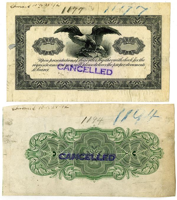 Pennsylvania. Lot of 2 items, includes a corresponding pair of Progress Proof documents from the Republic Bank Note Company: 9 x 5.5 inch order presentation, black text with black border, Eagle at center, Fine condition with notes made at top margin, as well as purple Cancelled stamp across document; Corresponding 9 x 5 inch intaglio underprint in green, also features notes made at top margin and Cancelled stamp, Fine condition. 2 pieces, with green piece possibly intended to serve as background. RBN. (2)