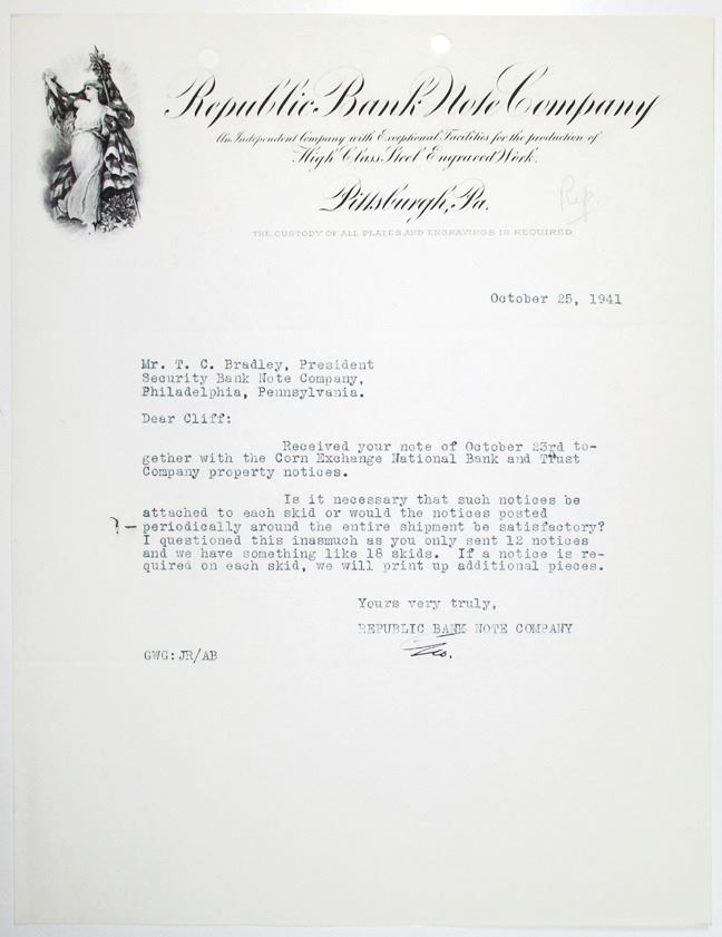 Pennsylvania, 1941. Typewritten letter from the Republic Bank Note Co., with company letterhead, regarding the printing of notes for the Corn Exchange National Bank and Trust Company. Black text with Allegorical Liberty at top left corner. VF condition with "Rep" written in pencil at top. RBNC.