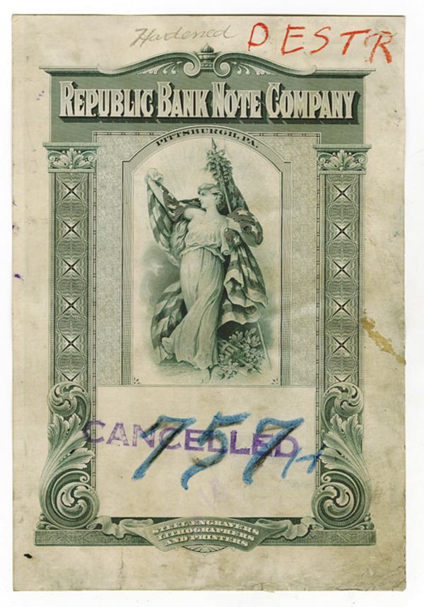 Pittsburgh, Pennsylvania. 5.5 x 8 inches, Dark green on thin card, Standing allegorical Liberty in middle under title, top margin has notation "Hardened" and partial crayon "Destr", purple "Cancelled" with number "757H" hand written. VF to XF condition. Rare advertising piece. RBNC.
