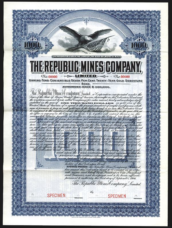 ME. $1000 Specimen 7% Gold Coupon Bond. Black on Blue border, Patriotic eagle on top with flag, possibly a Western mine. ABNC.