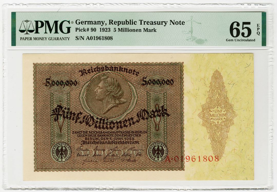 Germany, 1923, 5 Millionen Mark, P-90 Issued Banknote, Brown blue, cameo head in middle, back brown and green, S/N A-01961808, PMG graded Gem Uncirculated 65 EPQ. Scarce in high grade.