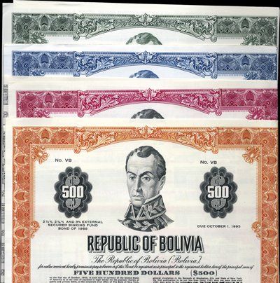 1968. $50; $100; $500; $1000. 4 different specimen bonds. All have vignette of Bolivar. All are different colors. All at various interest rates. All in choice condition. Coupons attached. Rare Bolivia bonds. De La Rue BNC.