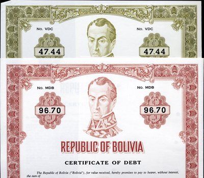 1968. 3 different specimen bonds. All have vignette of Bolivar. 2 are olive green and one is brick red. Denominations are $47.44; $49.27; and $96.70. These certificates were for payment of "Arrears of Interest on its External Secured Dollar Bonds and Scrip". All in choice condition. Rare Bolivia bonds. De La Rue BNC.