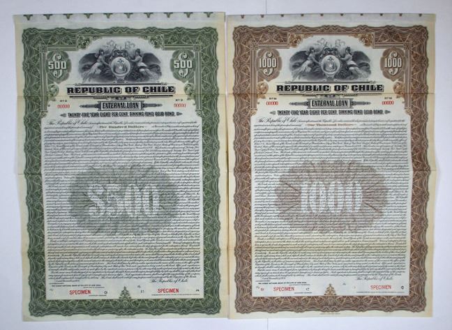Chile, 1921. $500 & $1000, Lot of 2, 8% Specimen 25 Year Sinking Fund Gold Coupon Bonds with Green and Brown borders, Both have allegorical winged figures flanking seal of Chile at top, and both have Specimen overprints and POCs, VF-XF condition. ABNC. (2). Sold "AS IS" no returns accepted.