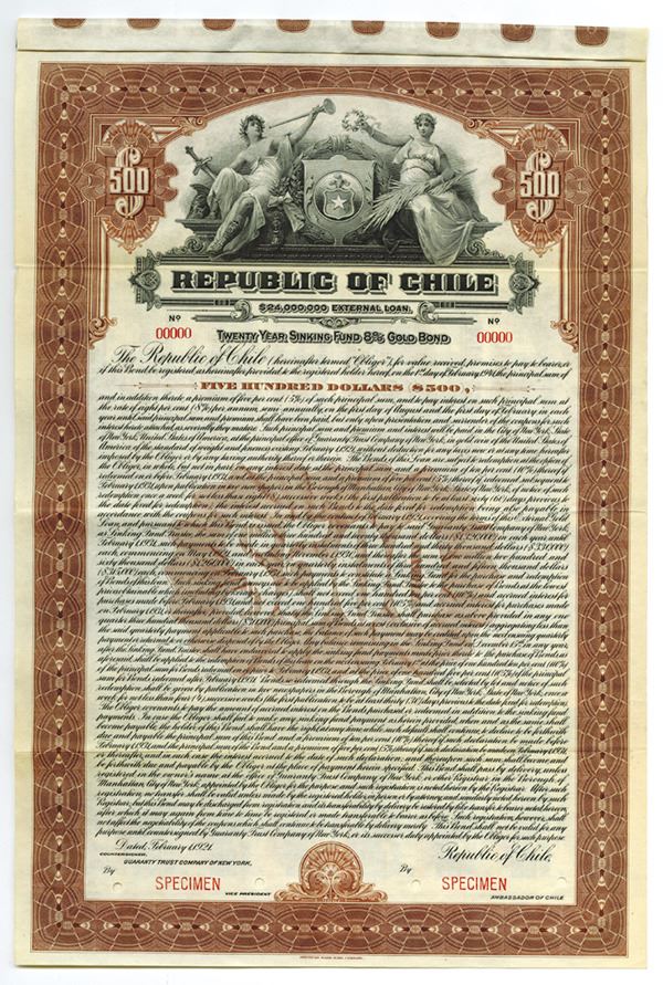 Chile. $500 Specimen 8% Sinking Fund Gold Coupon Bond, Black print on brown border and under tint, Allegorical women at top flanking shield with image on it, Specimen overprints and POC's, VF-XF condition, ABNC.