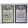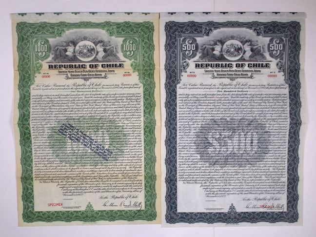 Chile, 1922. $500 & $1000 Lot of 2, 7% Specimen External Loan Sinking Fund Gold Coupon Bonds with Navy Blue and Green borders, Both have allegorical female figures flanking seal of Chile at top, and both have Specimen overprints and POCs, VF-XF condition with minor toning. ABNC. (2). Sold "AS IS" no returns accepted.