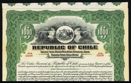 Chile, 1922, $1,000, 7% 20 year external loan sinking fund gold bond, Black on green border and underprint, Allegorical women flanking arms of Chile vignette, Specimen with coupons, VF condition, ABNC. Overprinted with legend, rare variety with only 3 found in the archive.