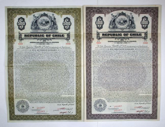 Chile, 1930. $500 & $1000, Lot of 2, 6% Specimen External Loan Sinking Fund Gold Coupon Bonds with Olive Green and Dark Brown borders, Both have allegorical male figures flanking seal of Chile at top, and both have Specimen overprints and POCs, VF-XF condition. ABNC. (2). Sold "AS IS" no returns accepted.