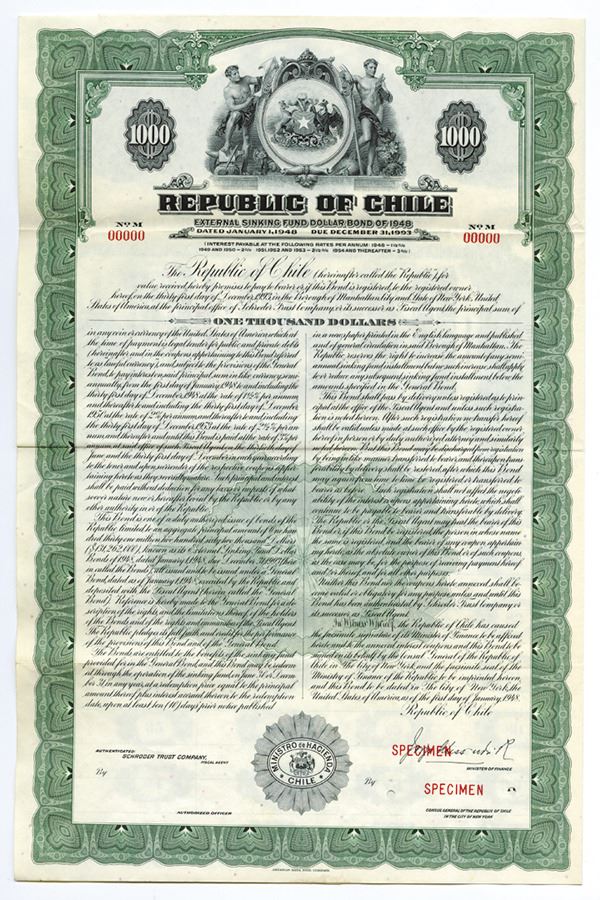 Chile. $1000 Specimen 1 1/2%-3% External Sinking Fund Coupon Bond, Black print on green border and under tint, Allegorical men at top flanking seal of Chile at top, Specimen overprints and POC's, VF-XF condition, ABNC.