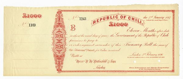 Chili. 1000 Pound Specimen Treasury Bill, No. 1169 on counterfoil and No. 1234 on main piece, payable at N.M. Rothschild & Sons, London. BWC. XF+ with rough edges.