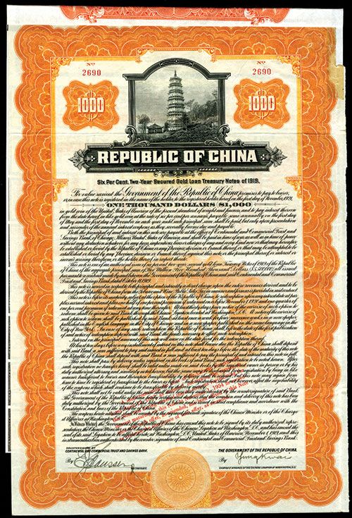 China, 1919, $1000, I/U bond, 6% 2 Year Secured Gold Loan Treasury Notes of 1919, Coupons attached. Orange border and undertint. Pagoda on hillside vignette on top, Bond is in English and payable in U.S.Legal Tender. S/N 2690, XF condition. ABNC.