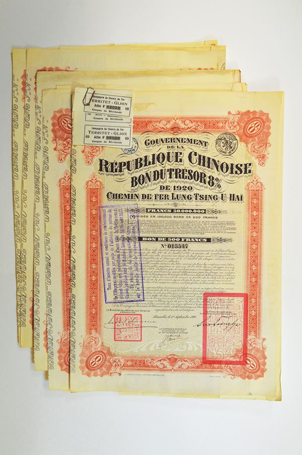 Issued by La Compagnie Generale de Chemins de Fer et de Tramways en Chine le Belegue. 500 Francs. With coupons. 5 pieces.