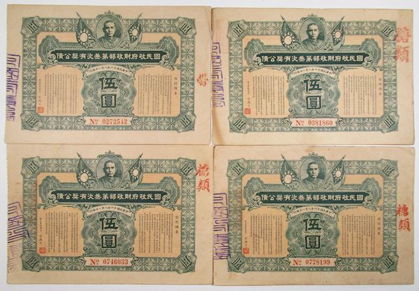China - Taiwan. Lot includes a quartet of I/C war bonds, featuring Dr. Sun Yet-sen flanked by Chinese nationalist flags. VF with various handstamps. (4)