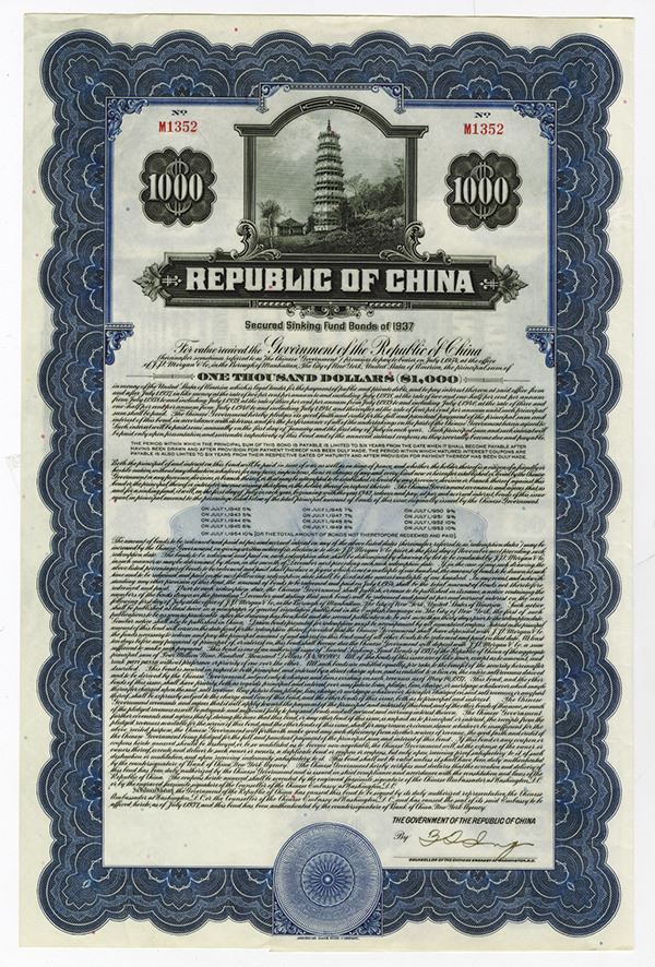 China, 1937, $1000, I/U bond, Secured Sinking Fund Bond of 1937, Pagoda. Coupons attached. Blue border and undertint. Pagoda on hillside vignette on top and on each coupon. Bond is in English and payable in U.S. Legal Tender. S/N M1352, XF condition. ABNC.