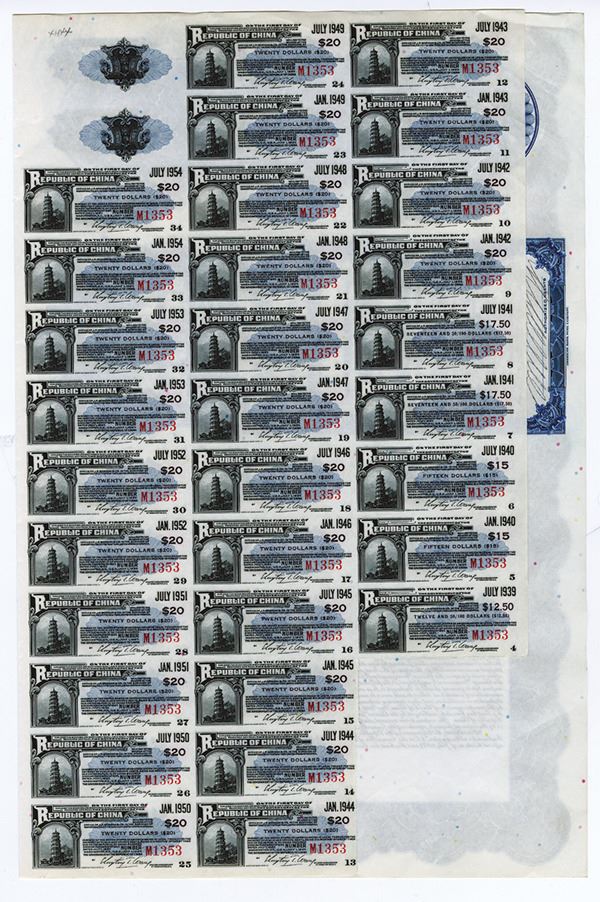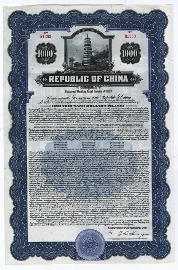 China, 1937, $1000, I/U bond, Secured Sinking Fund Bond of 1937, Pagoda. Coupons attached. Blue border and undertint. Pagoda on hillside vignette on top and on each coupon. Bond is in English and payable in U.S. Legal Tender. S/N M1353, XF condition. ABNC.