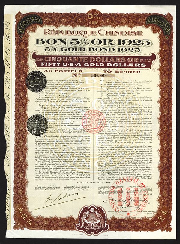 China, Republic. Known as the Boxer Loan, these bonds were issued to assist in the payment of the huge indemnity to European and American powers resulting from the 1901 event. 17 Coupons remain. Written in French and English. Printed in France with hand stamp of the Inspector General of Customs. (From the John E. Herzog Collection)