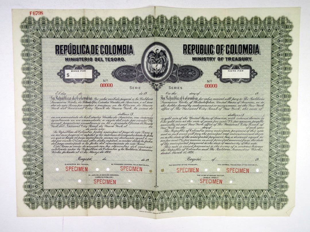 Colombia, 1920. $Odd Specimen 7% Bond in Spanish and English, Black text with green border and background, Colombia coat of arms at top center. Red specimen overprints, 00000 serial numbers, and POCs. VF condition, FL-ABNC.