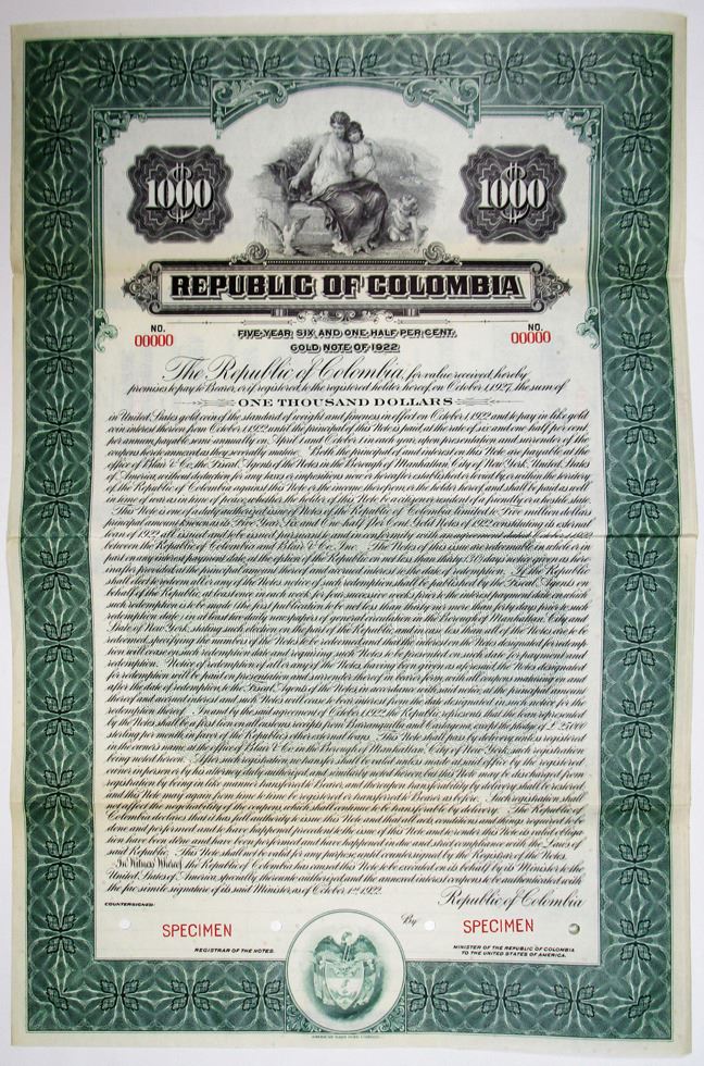 Colombia, 1922. $1000 Specimen 6.5% Gold Coupon Bond, Black text with green border and undertint, Allegorical woman with two children at top center. Red specimen overprints, 00000 serial numbers, and POCs. VF condition, ABNC.