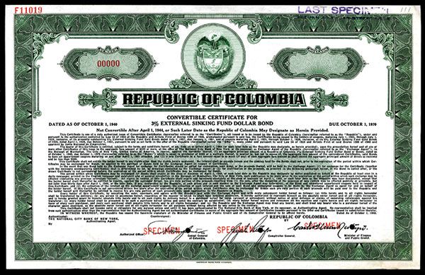 Colombia. 1940. $- 3% Specimen Bond. Black print with green border and underprint. Country seal top center. VF condition. POC's and red SPECIMEN overprints. ABNC.