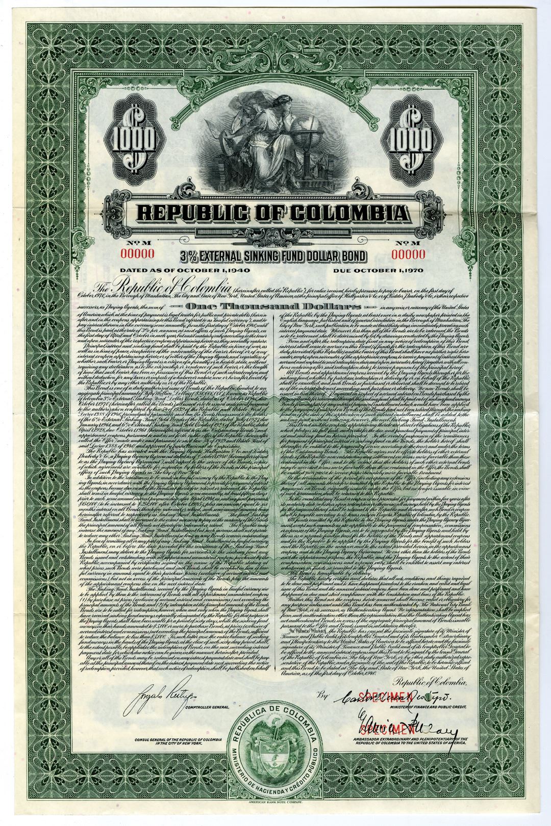Colombia, 1940. $1,000 Specimen 3% External Sinking Fund Coupon Bond, Green border and underprint, Specimen overprints and POC's, VF-XF condition, ABNC.