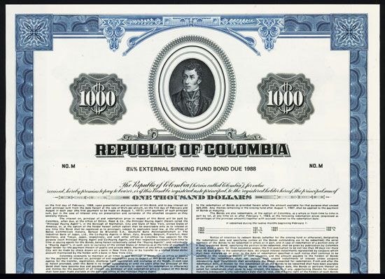 Colombia, 1973, $1000, 8 1/4% External Sinking Fund Series M Specimen Bond, Coupons attached, Black on blue border and underprint, Portrait of notable gentlemen top center, Pink SPECIMEN overprints POC's, VF-XF condition, ABNC.