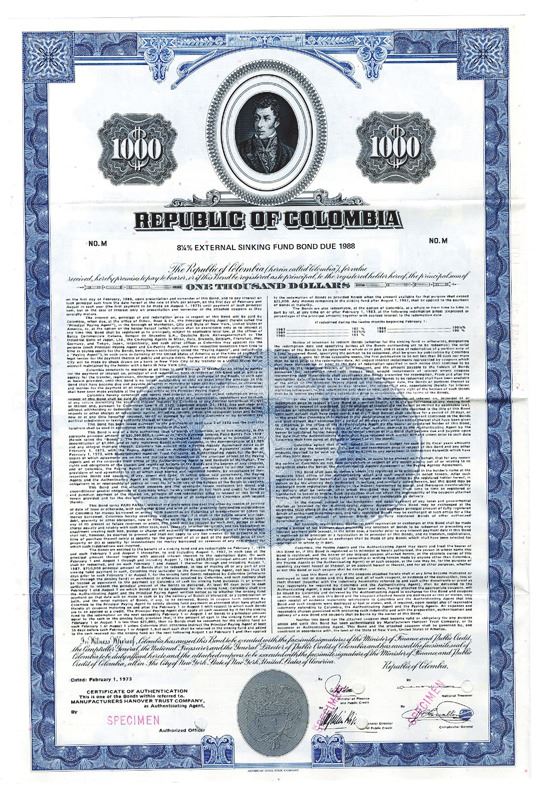 Colombia. $1000 Specimen 8 1/4% External Sinking Fund Coupon Bond, Black print on blue border and under tint, Portrait of a man at top, Specimen overprints and POC's, VF-XF condition, ABNC.