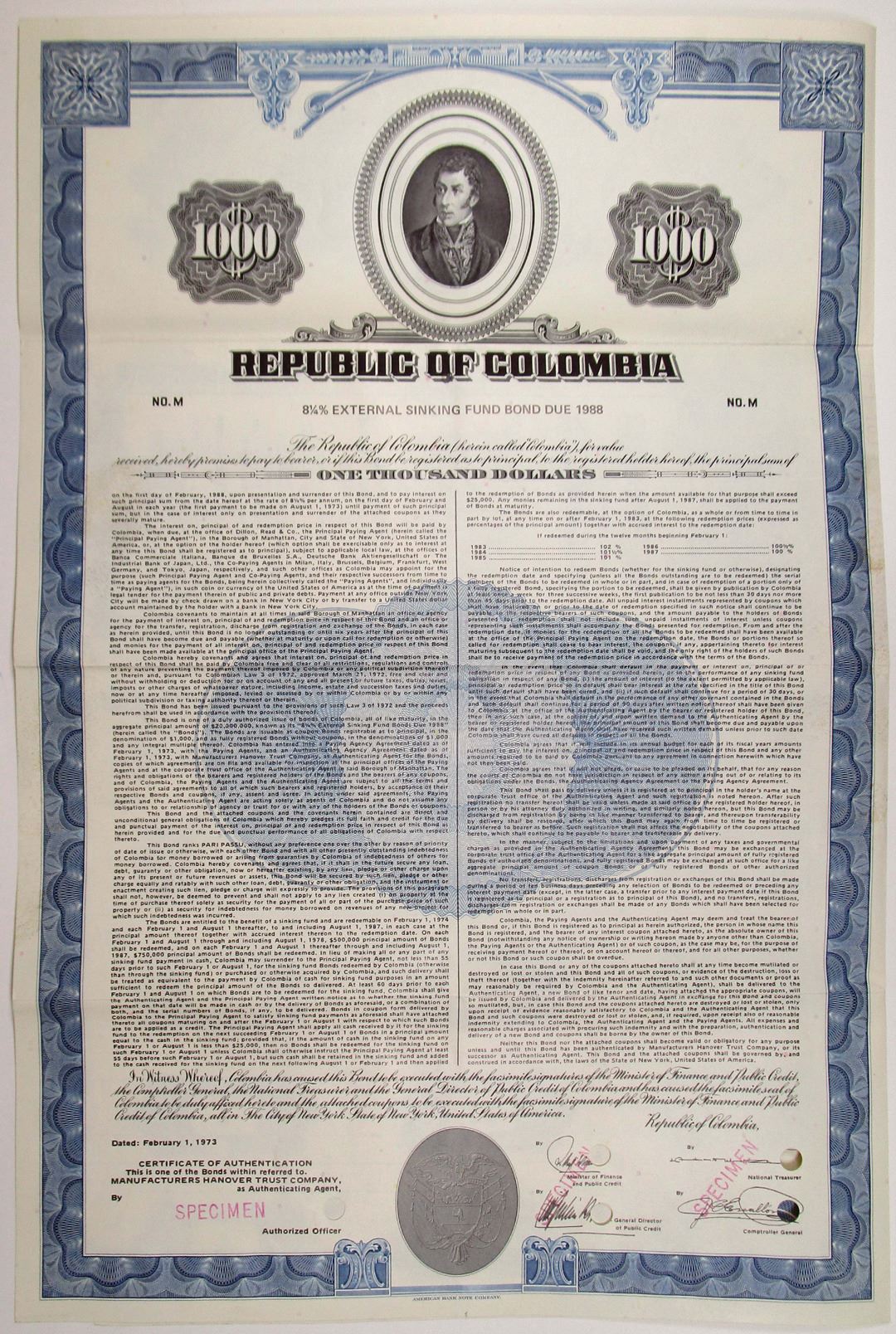 Colombia, 1973. $1000 Specimen 8.25% External Sinking Fund Coupon Bond, Black text with blue border and undertint, Simon Bolivar portrait at top center. Pink specimen overprints and POCs. VF condition, ABNC.