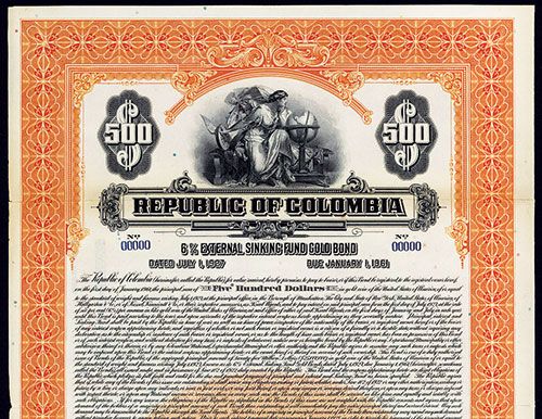 Columbia, 1927, $500, 6% External Sinking Fund Gold Specimen Bond, Vertical format, Coupons attached, POC's, VF-XF condition, ABNC.