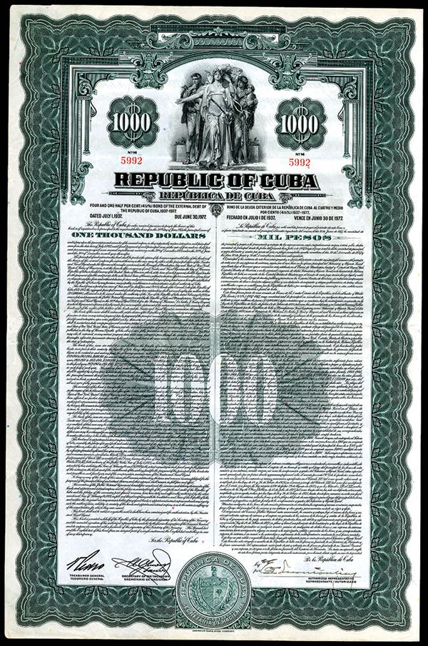 Republic of Cuba, 1937, 40 year Bearer Bond Cuba, $1,000.00 Bond, Allegorical figures, Green on Cream, ABNC, Historic Bond in that payments suspend Dec. 1960, I/U, VF+, Minor Graffiti on reverse.
