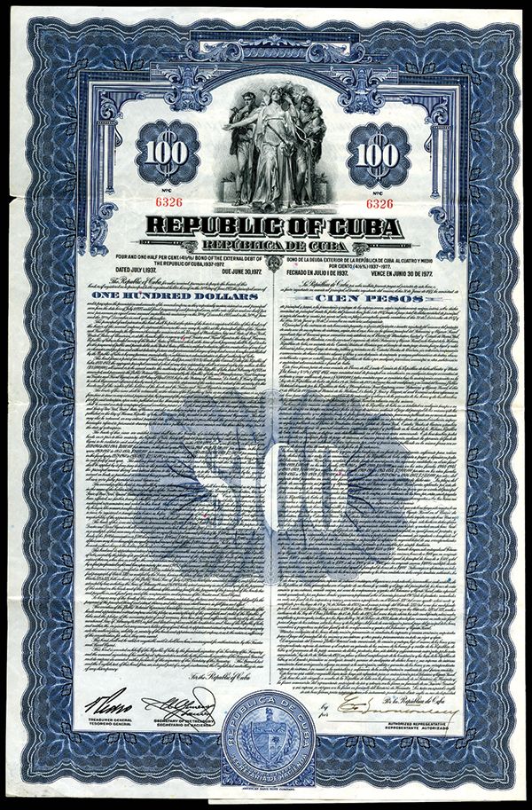 Republic of Cuba, 1937, 40 year Bearer Bond Cuba, $100.00 Bond, Allegorical figures, Blue on Cream, ABNC, Historic Bond in that payments suspend Dec. 1960, I/U, edge nick upper left section, VF+