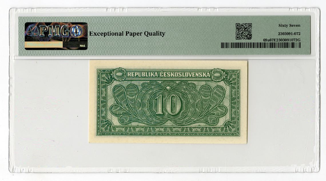 Czechoslovakia, 1950. 10 Korun, P-69a, Issued Banknote, Green printing, Back is green with denomination at center, S/N E046620, PMG graded Superb Gem Uncirculated 67 EPQ, TDLR. This is the highest and only Superb Gem Uncirculated note graded out of 22 graded for this series in the PMG census.