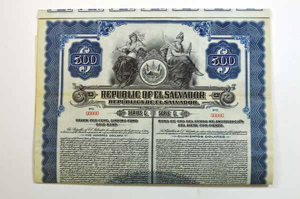 El Salvador. $500 Dollars Gold Coupon Bond Specimen. ABNC. Extremely Fine, edge tone.